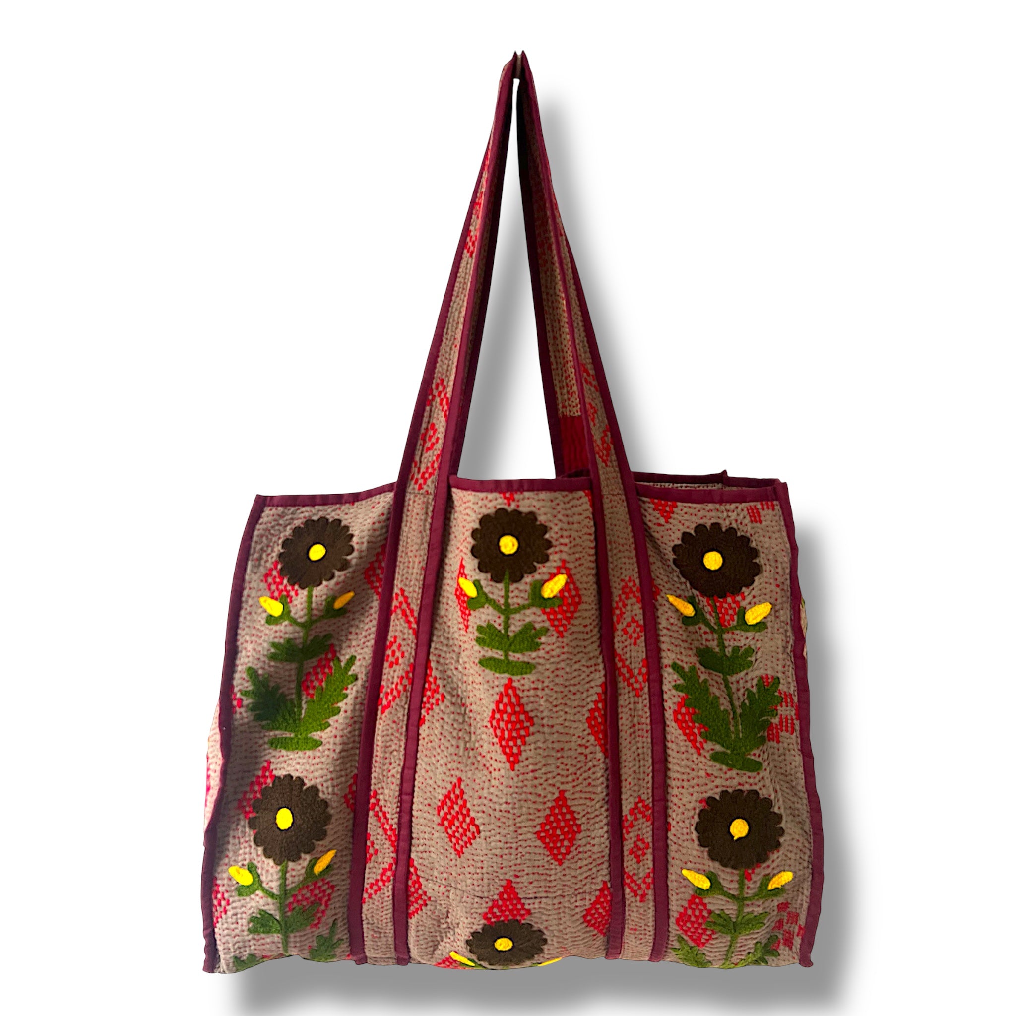Our beautiful Dharma bags have been repurposed from vintage Kantha textile and then accentuated with embroidered motifs.  Hand stitched and 100% cotton, these quirky fabulous one off pieces are sure to become your favourite.