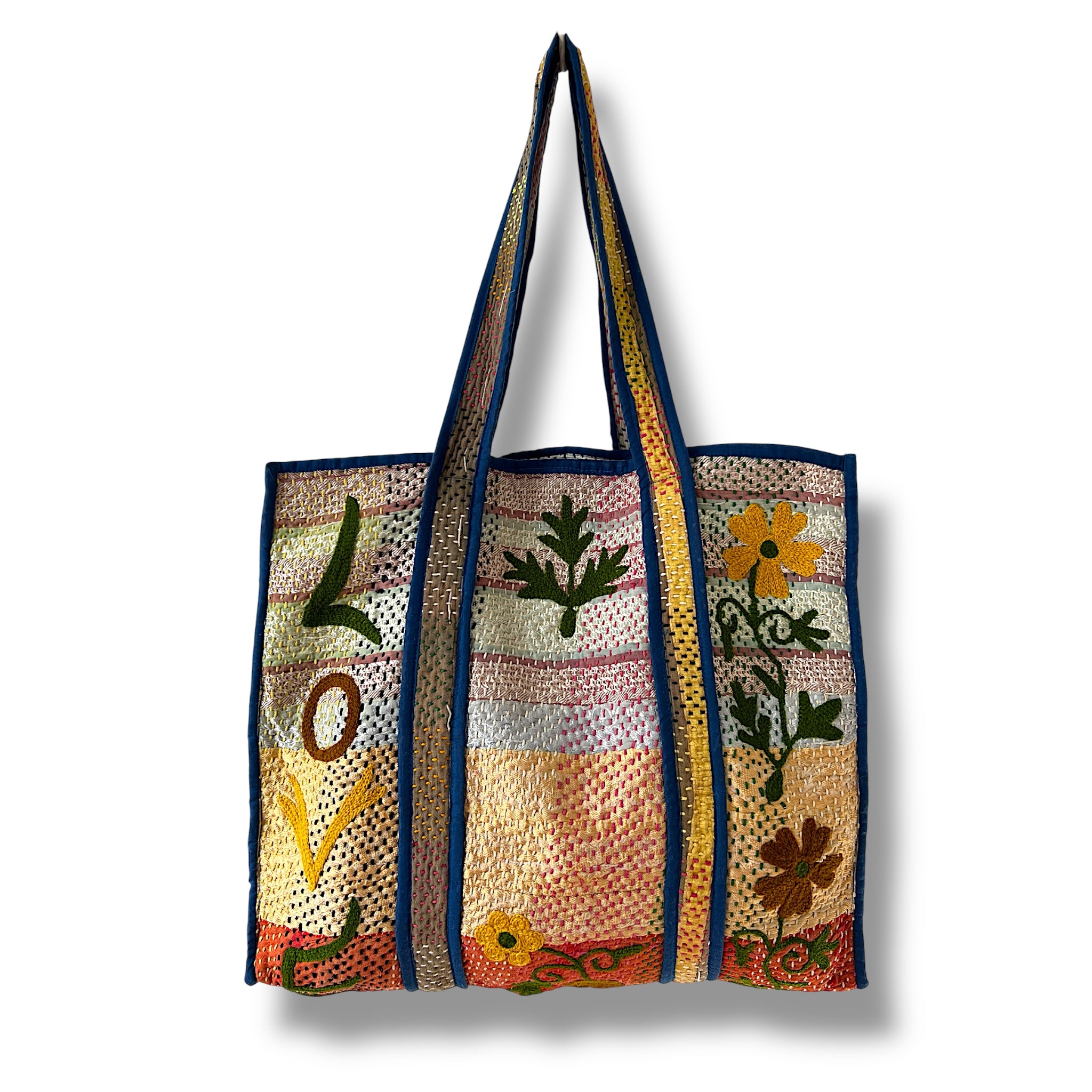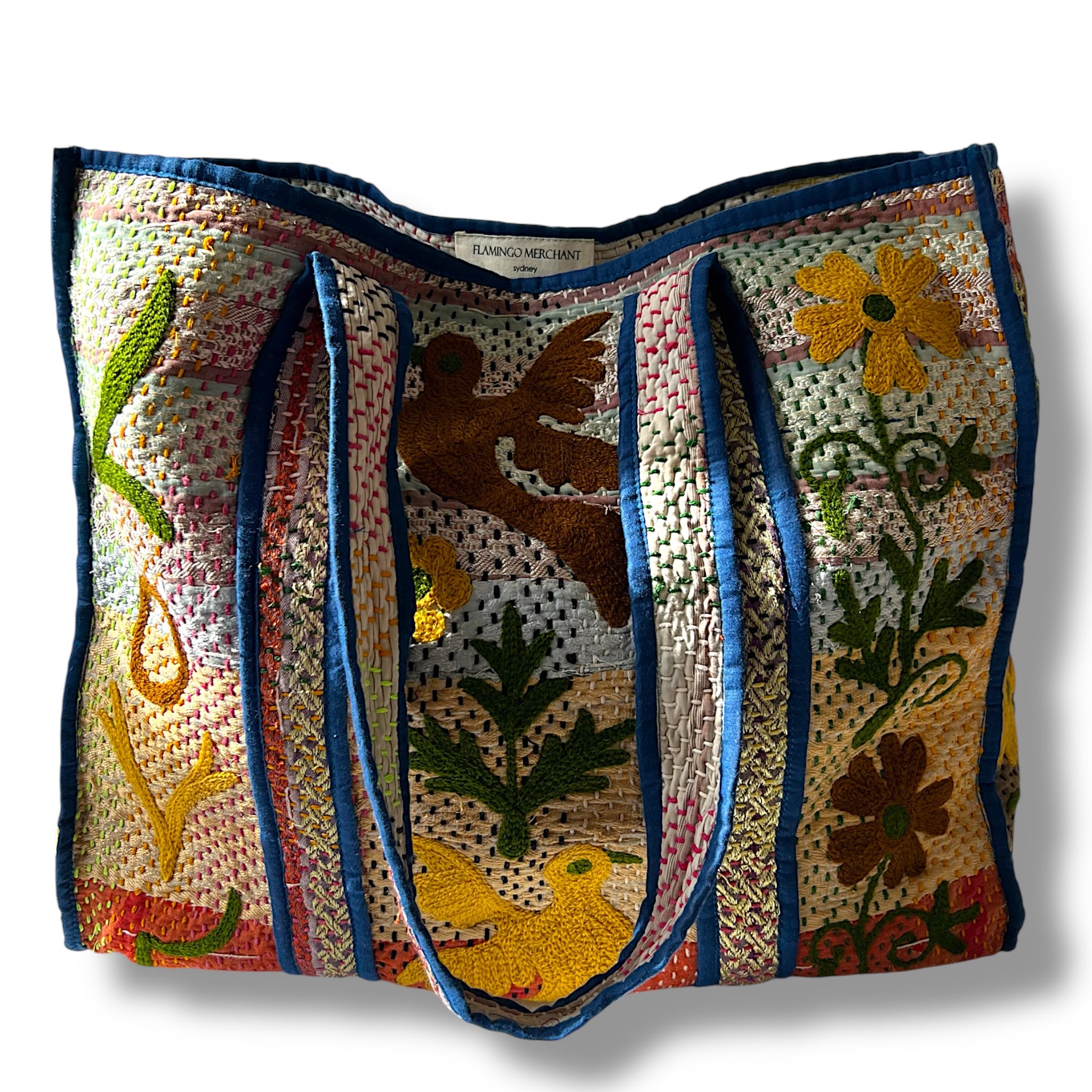 Our beautiful Dharma bags have been repurposed from vintage Kantha textile and then accentuated with embroidered motifs.  Hand stitched and 100% cotton, these quirky fabulous one off pieces are sure to become your favourite.