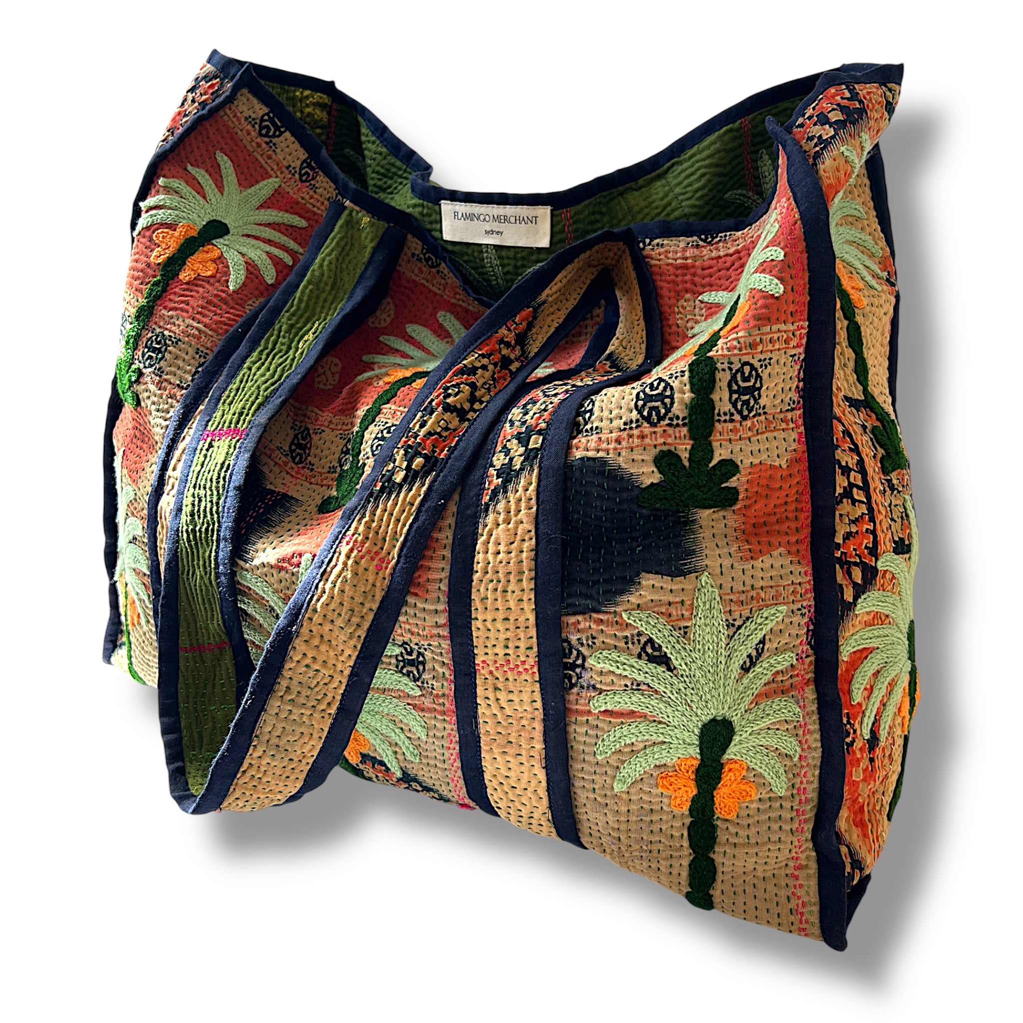 Our beautiful Dharma bags have been repurposed from vintage Kantha textile and then accentuated with embroidered motifs.  Hand stitched and 100% cotton, these quirky fabulous one off pieces are sure to become your favourite.