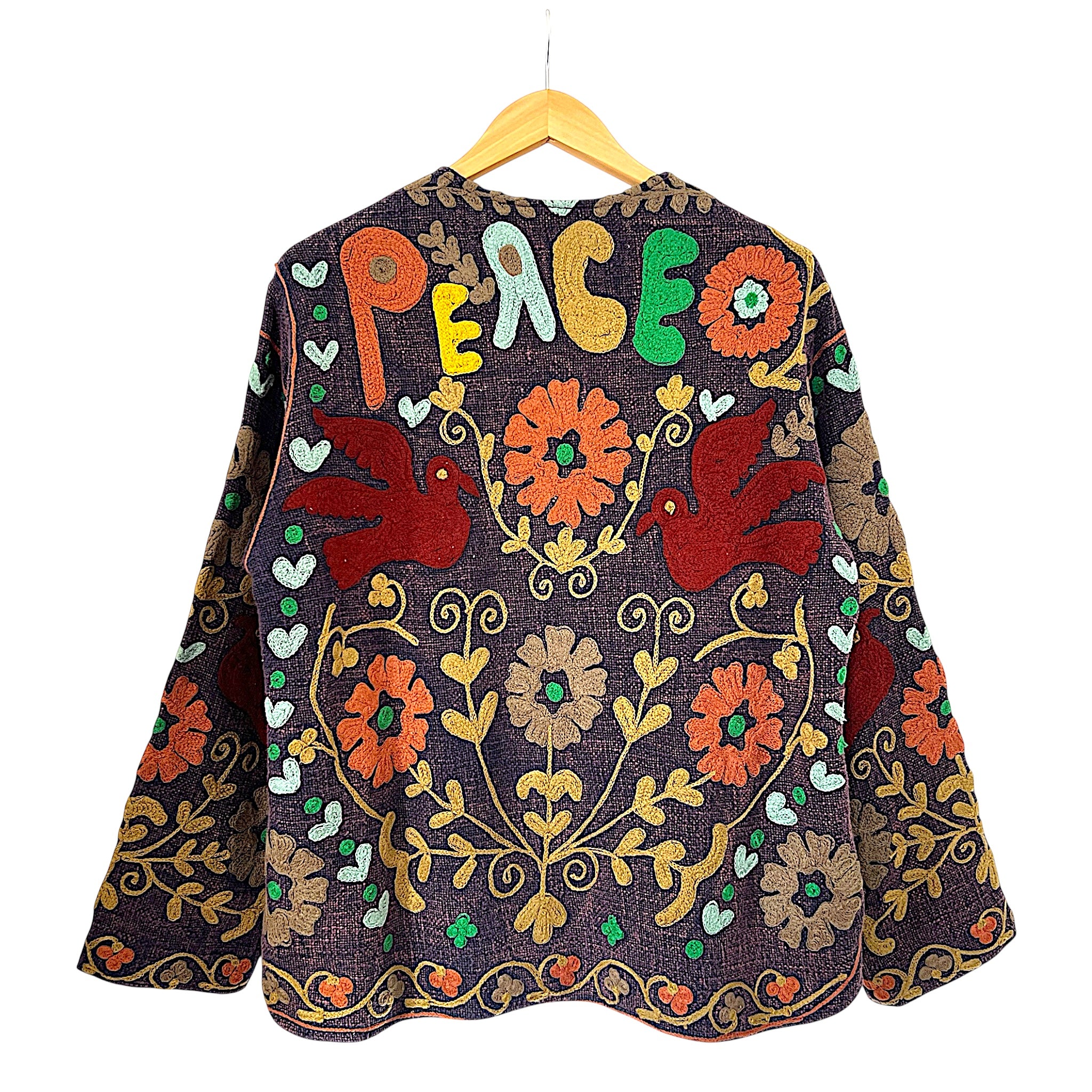 Beautiful hemp embroidered peace jacket with 100% cotton lining.