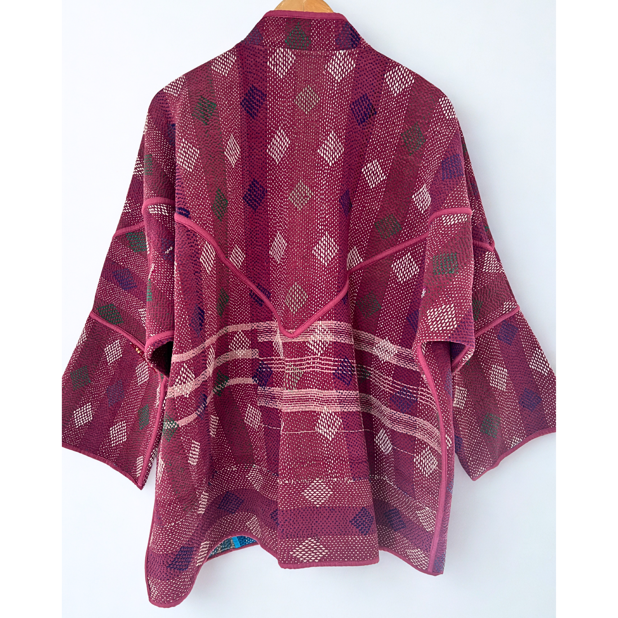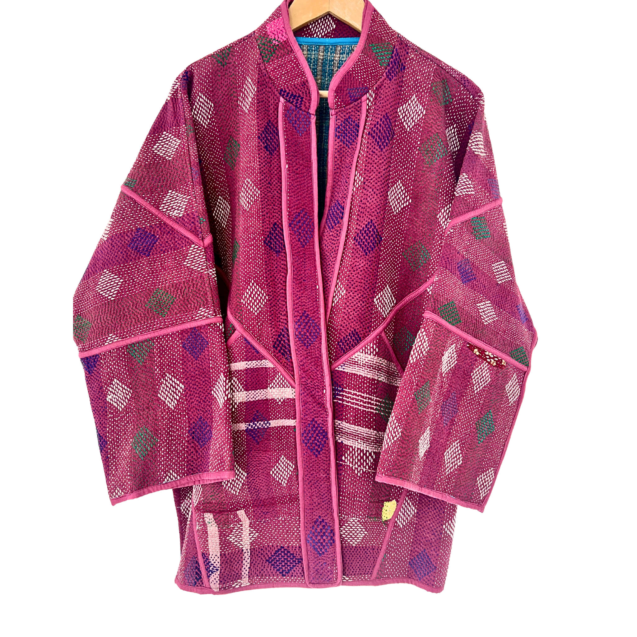 This jacket has been repurposed from vintage Kantha textile.  Fabulous oversized fit, fully reversible with  pockets on both sides.  Unisex and one size fits all.  100% cotton.