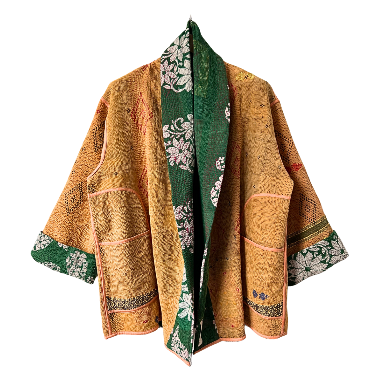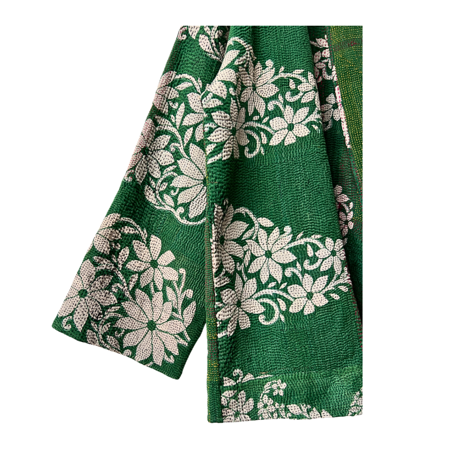 This jacket has been repurposed from vintage Kantha textile. Fabulous oversized fit, fully reversible with pockets on both sides. Unisex and one size fits all. 100% cotton.