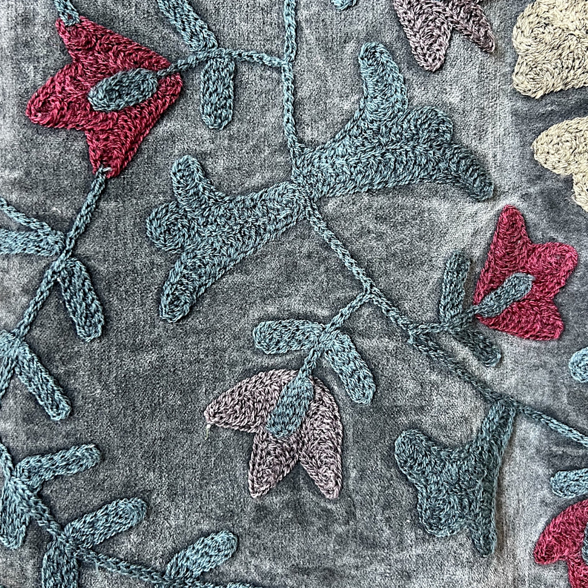 mid weight, velvet embroidered outer and 100% cotton lining with 2 pockets