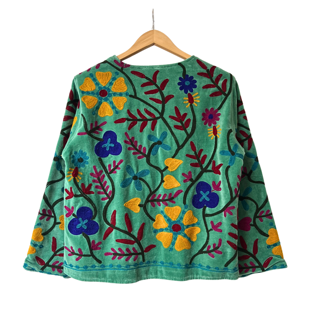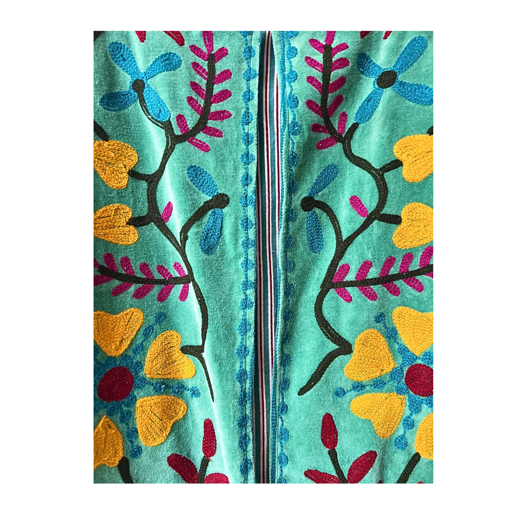 Beautiful embroidered collarless velvet jacket with floral motif and stripe cotton lining
