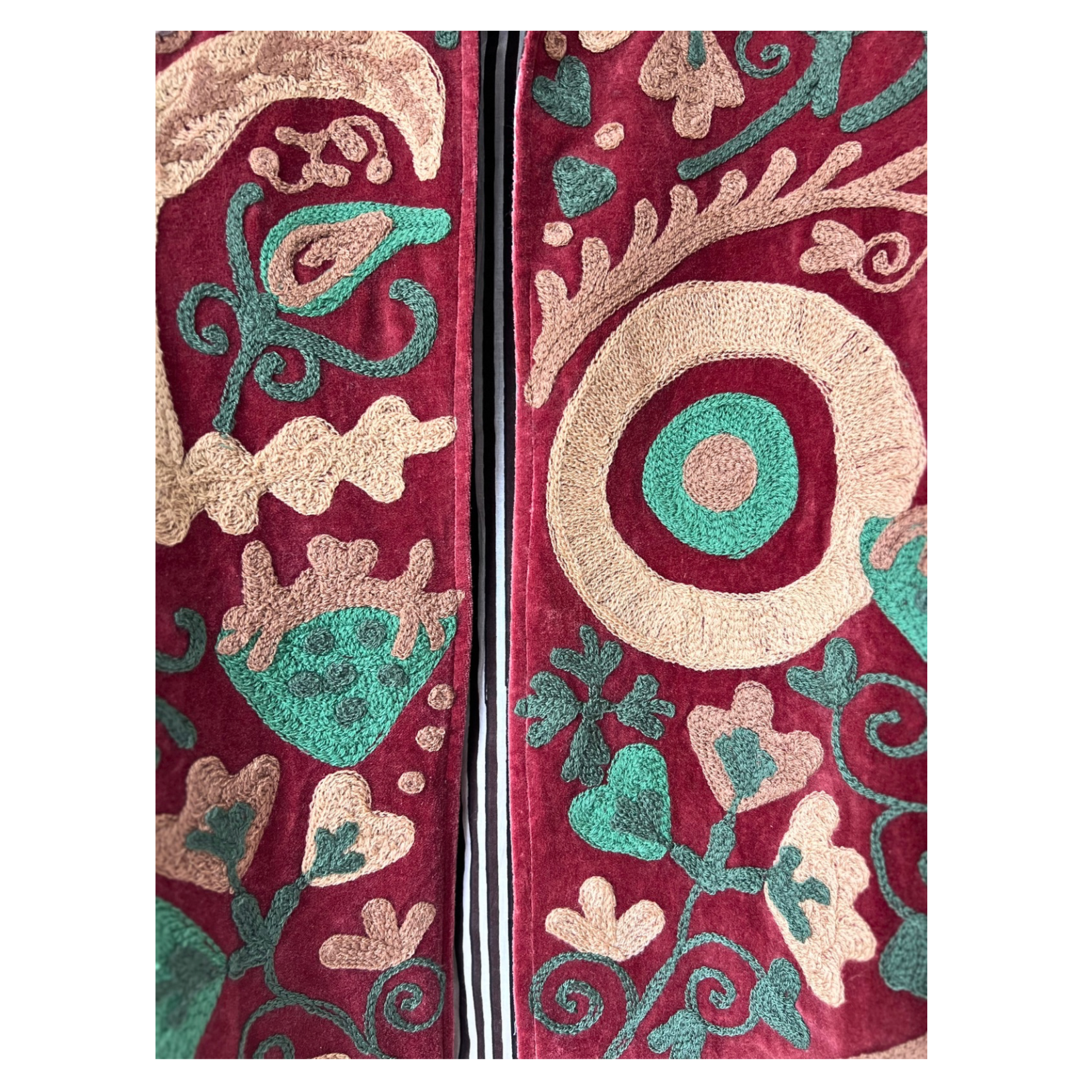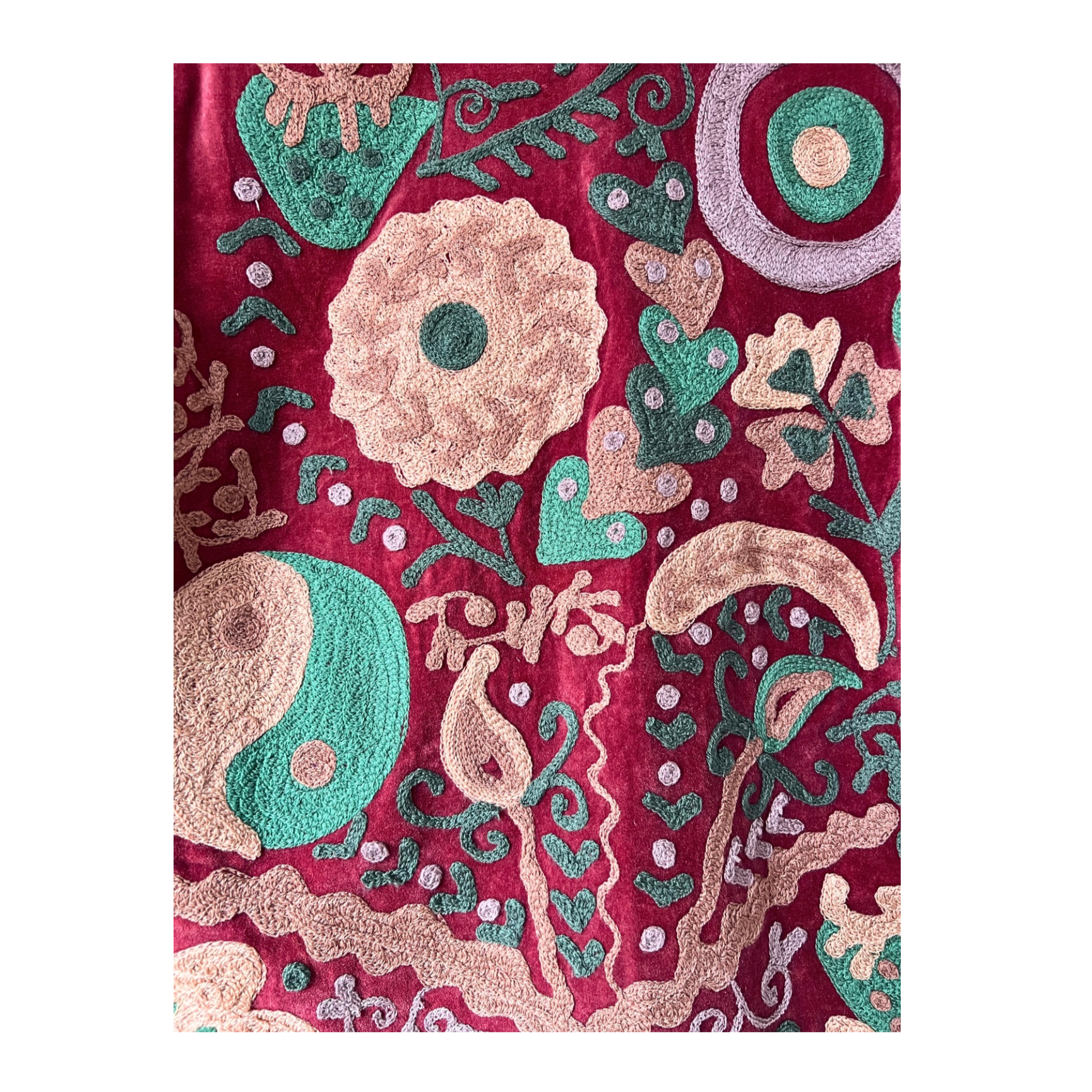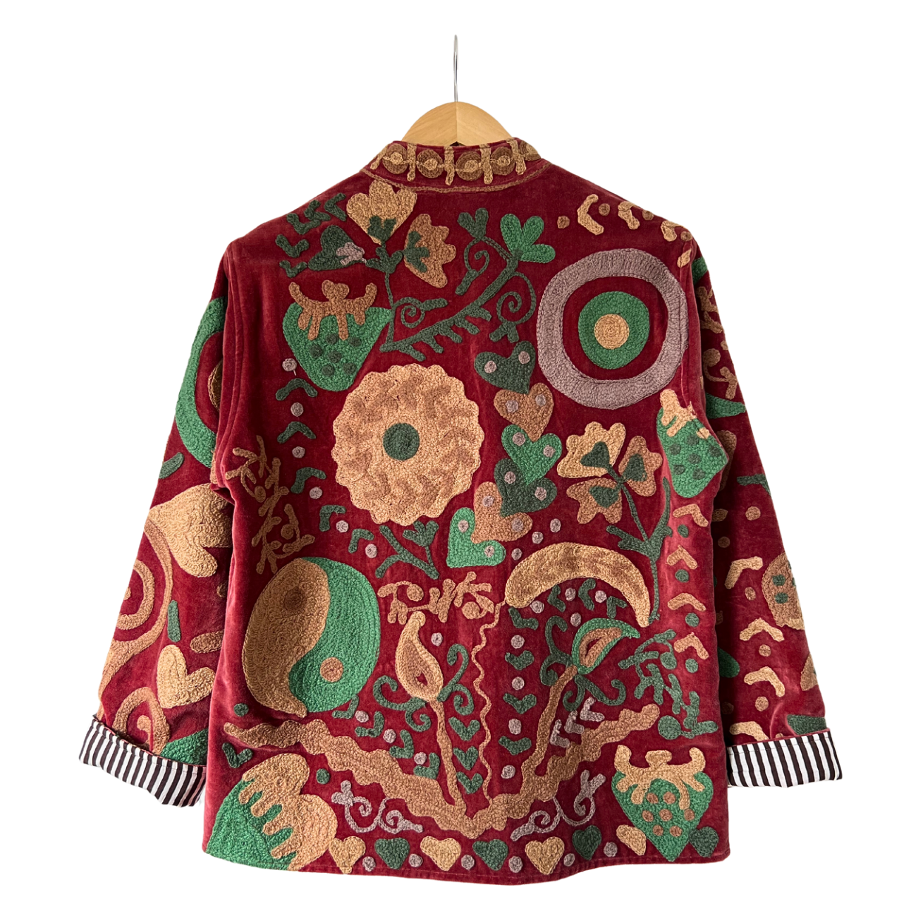 Embroidered jacket with evil eye and yin yang symbols adorned with love hearts and strawberries