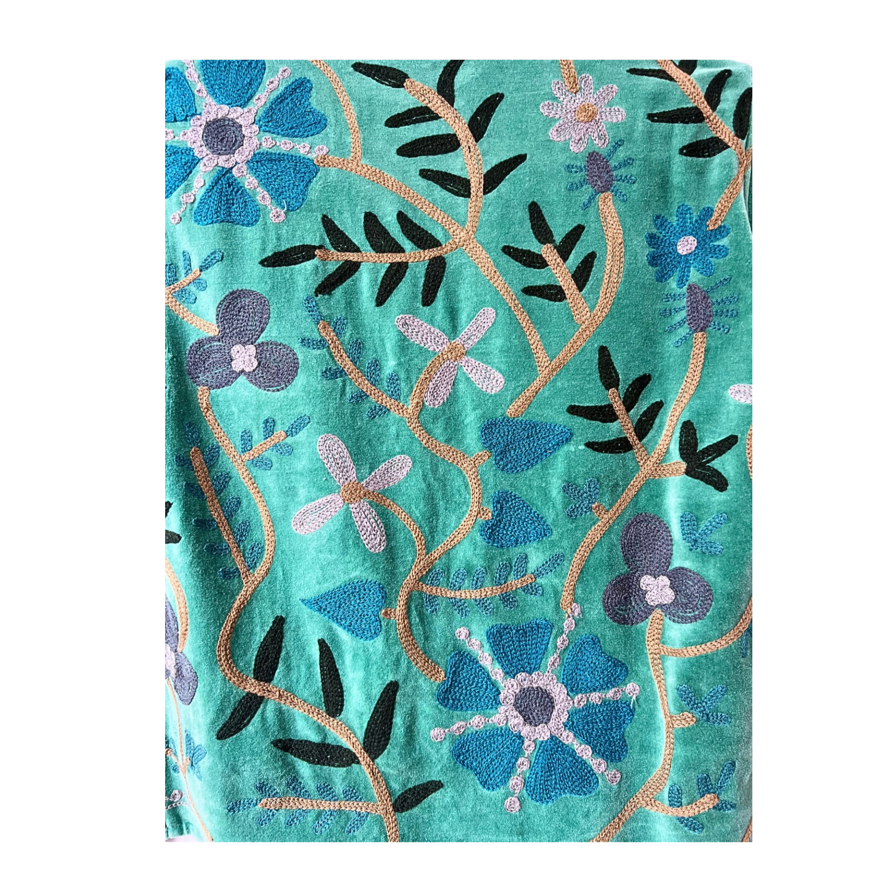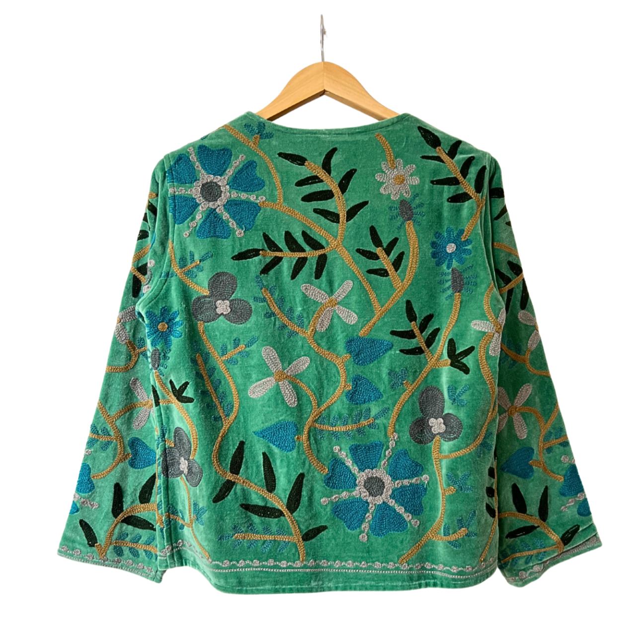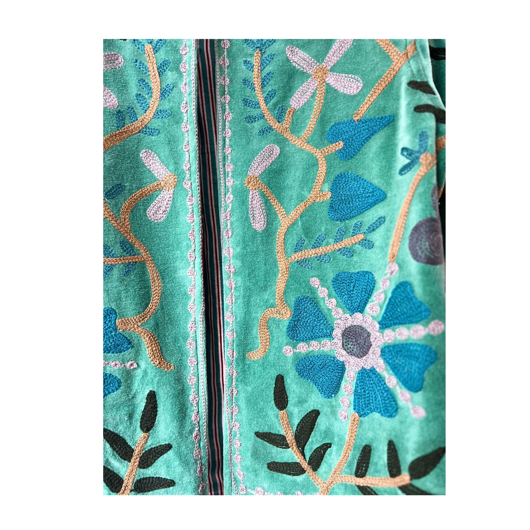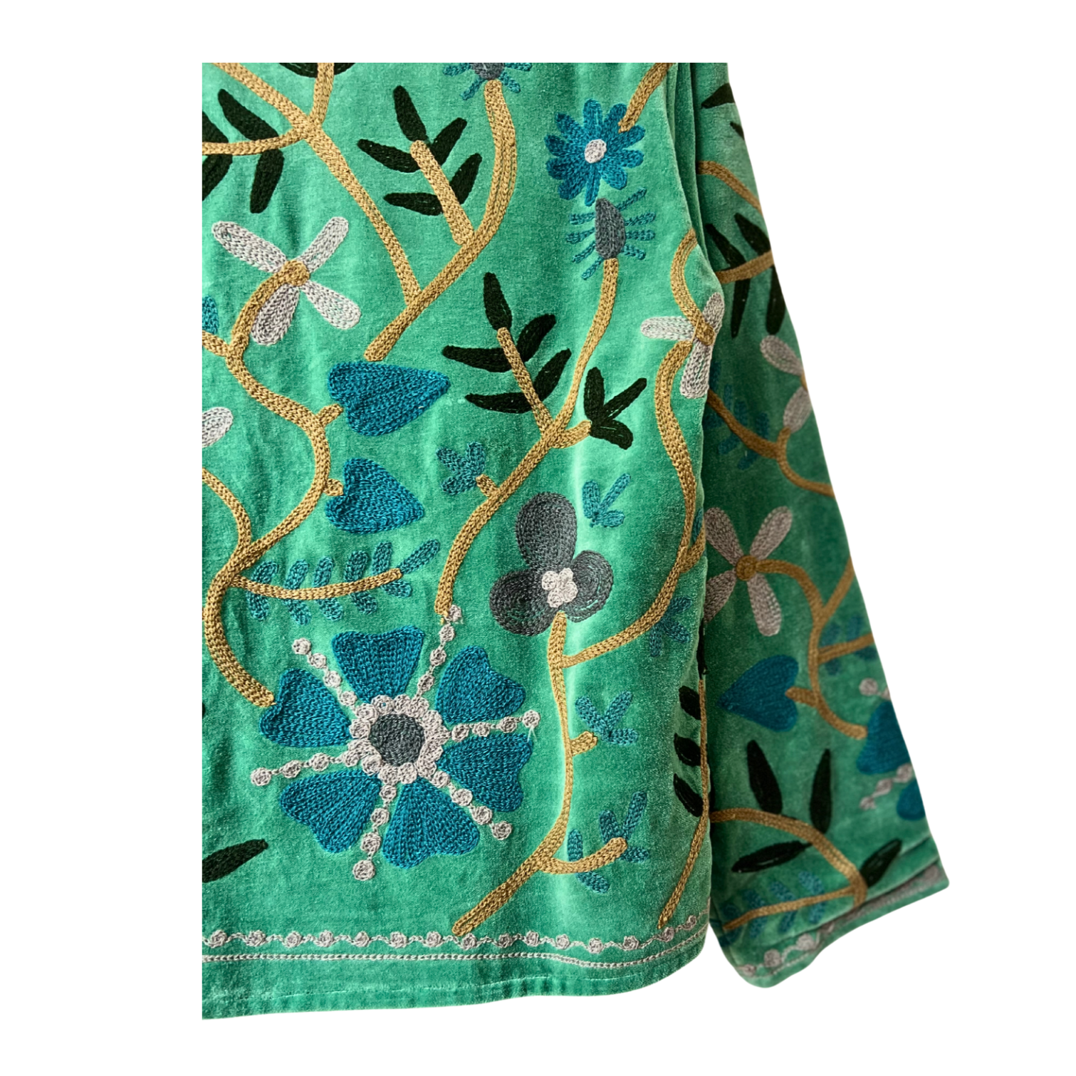 Beautiful embroidered collarless velvet jacket with floral motif and stripe cotton lining