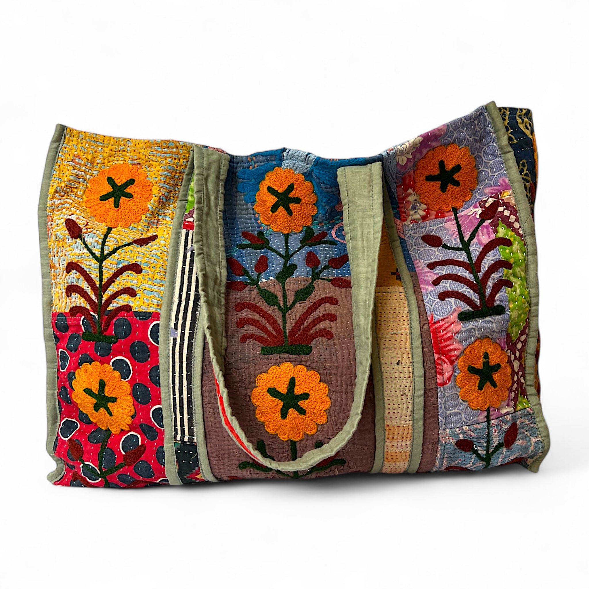 Our beautiful Dharma bags have been repurposed from vintage Kantha textile and then accentuated with our embroidered motifs.  Dharma part 2 range are all reversible, there is 1 pocket inside which becomes the outside pocket when reversed, both sides are included in photos.