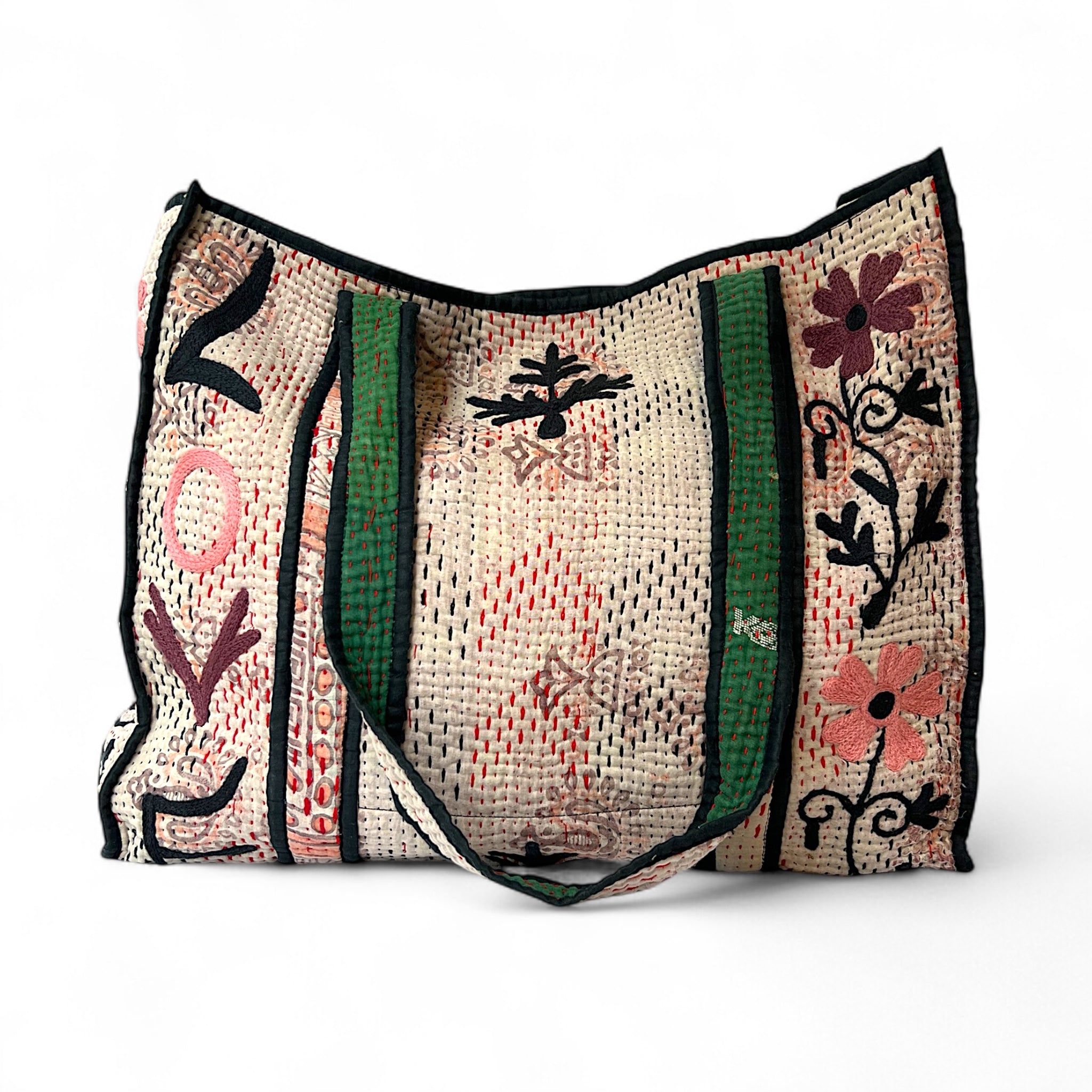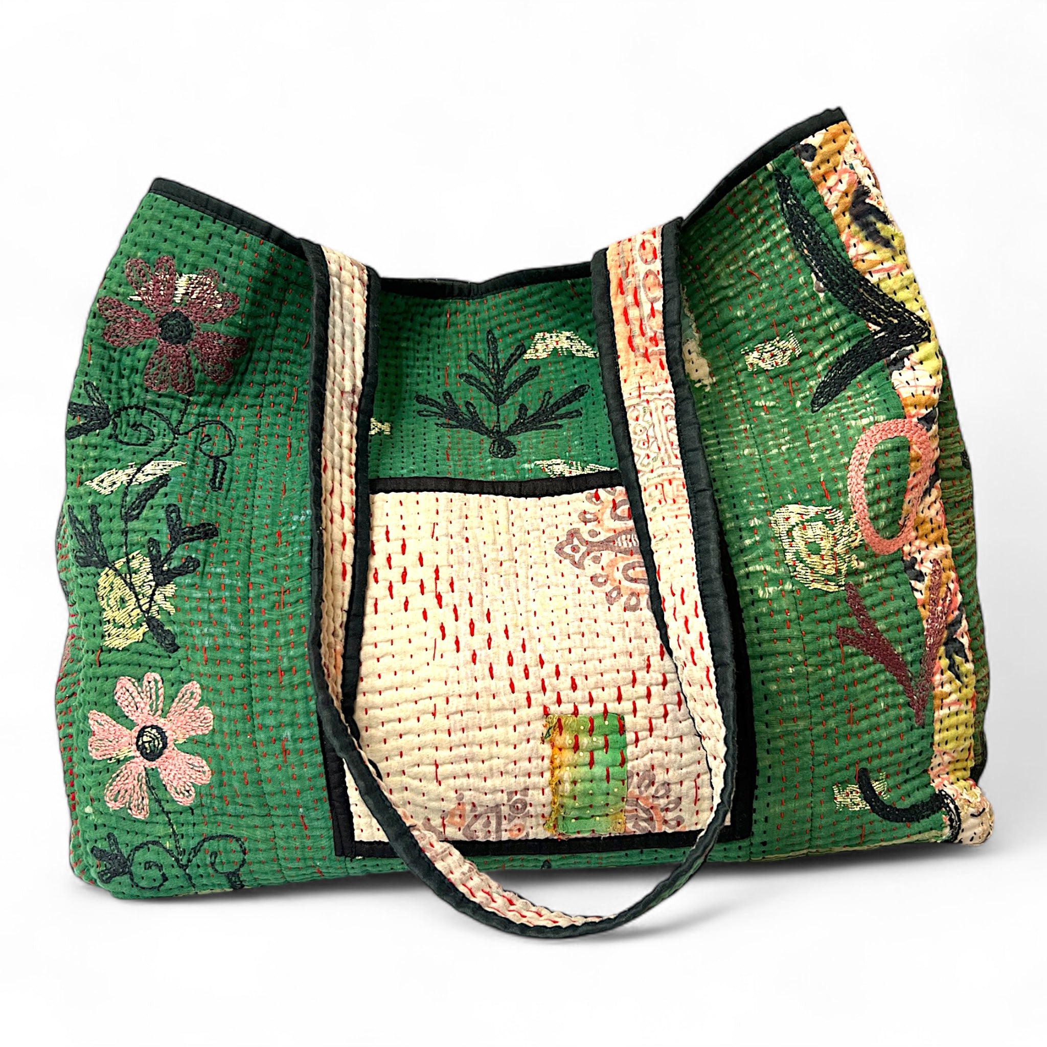 Our beautiful Dharma bags have been repurposed from vintage Kantha textile and then accentuated with our embroidered motifs.  Dharma part 2 range are all reversible, there is 1 pocket inside which becomes the outside pocket when reversed, both sides are included in photos.