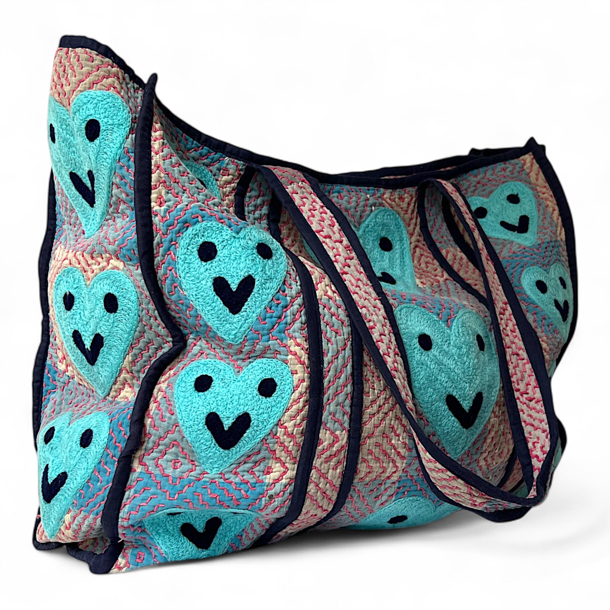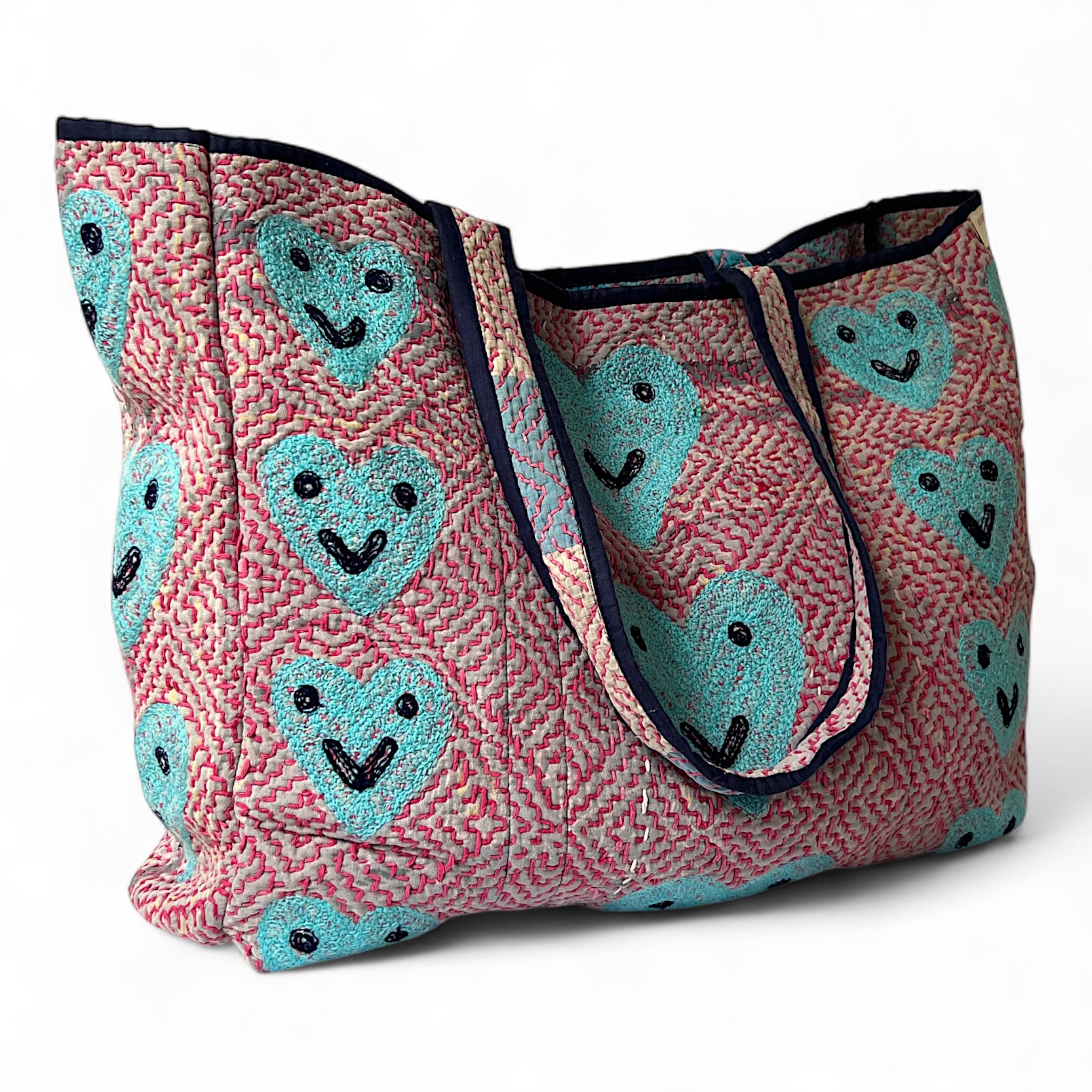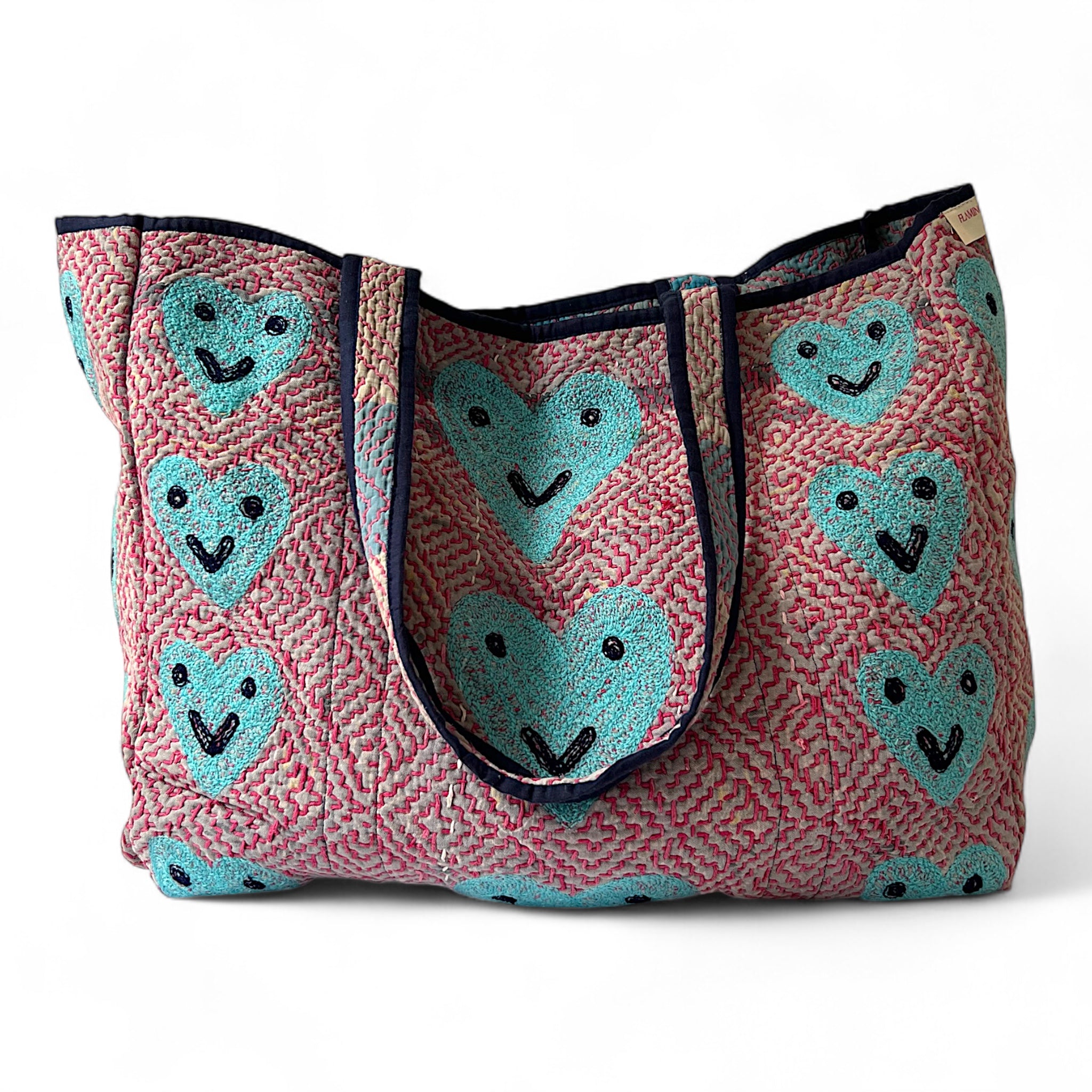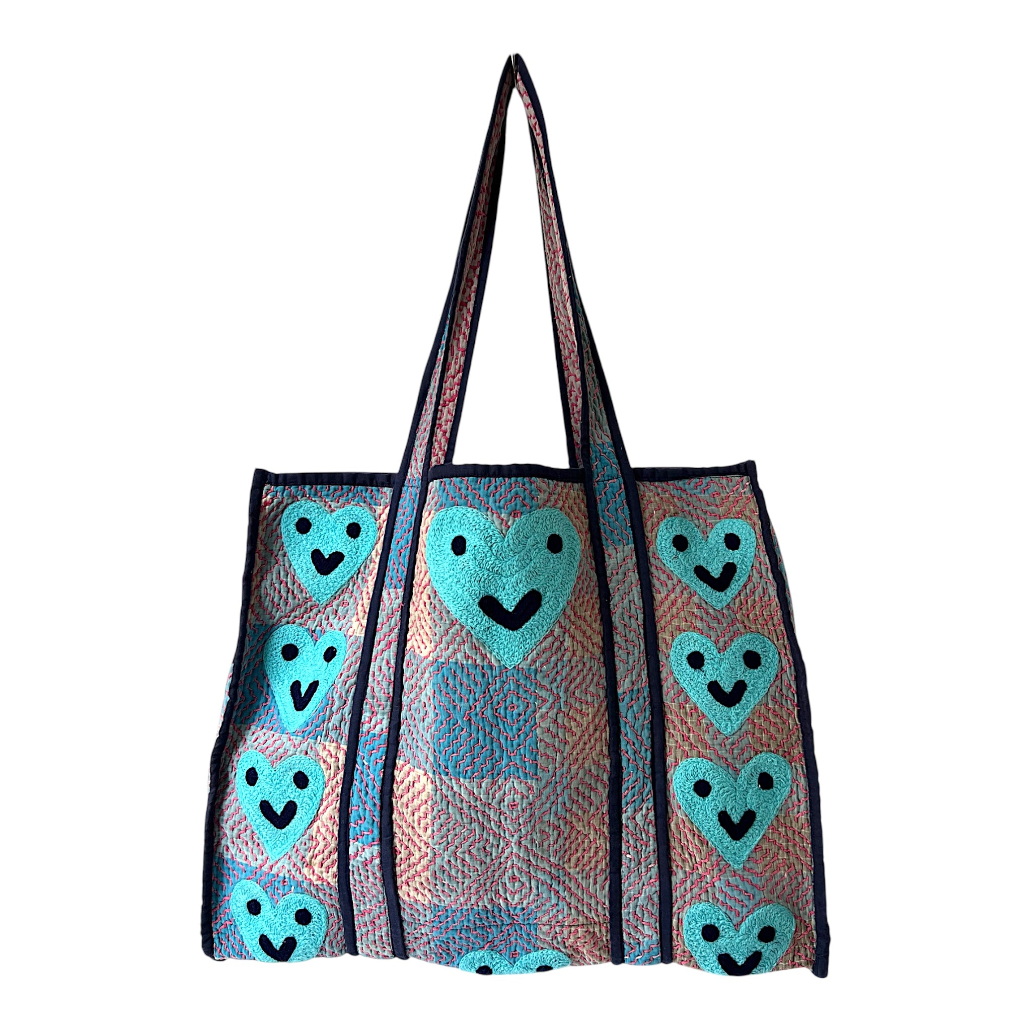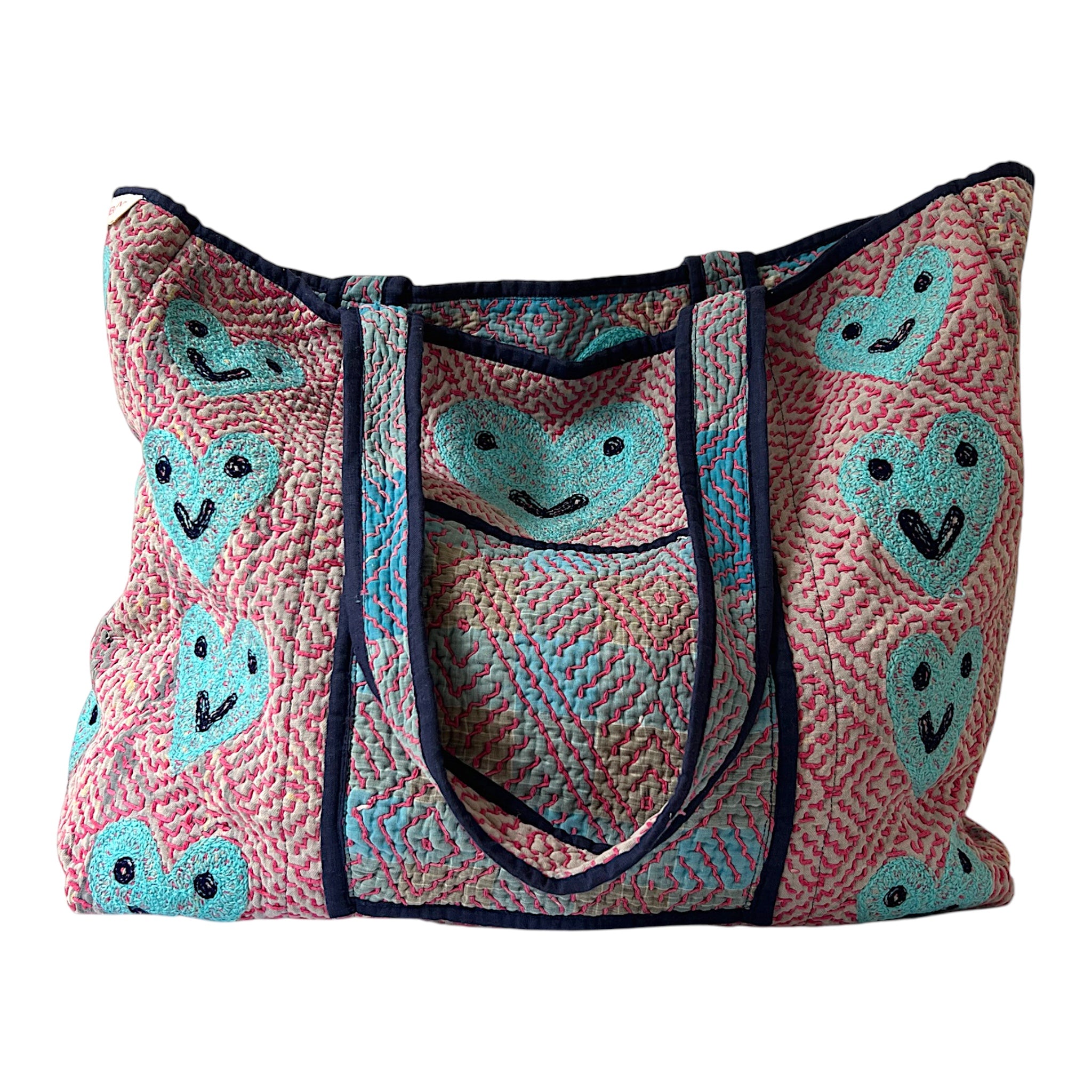 Our beautiful Dharma bags have been repurposed from vintage Kantha textile and then accentuated with our embroidered motifs. Dharma part 2 range are all reversible, there is 1 pocket inside which becomes the outside pocket when reversed, both sides are included in photos.