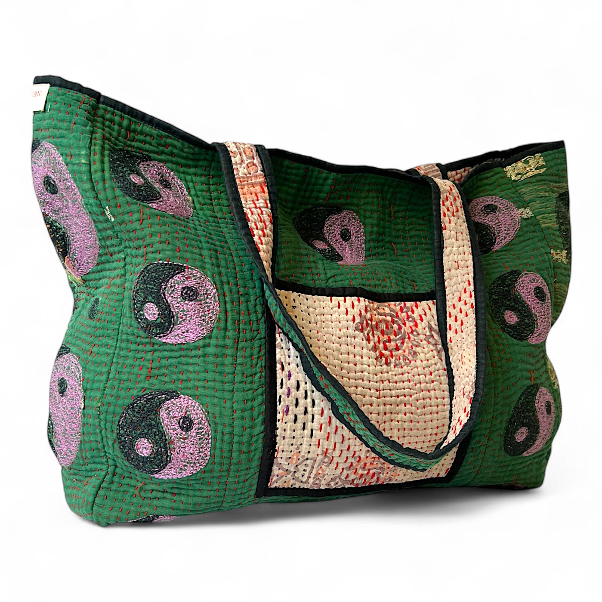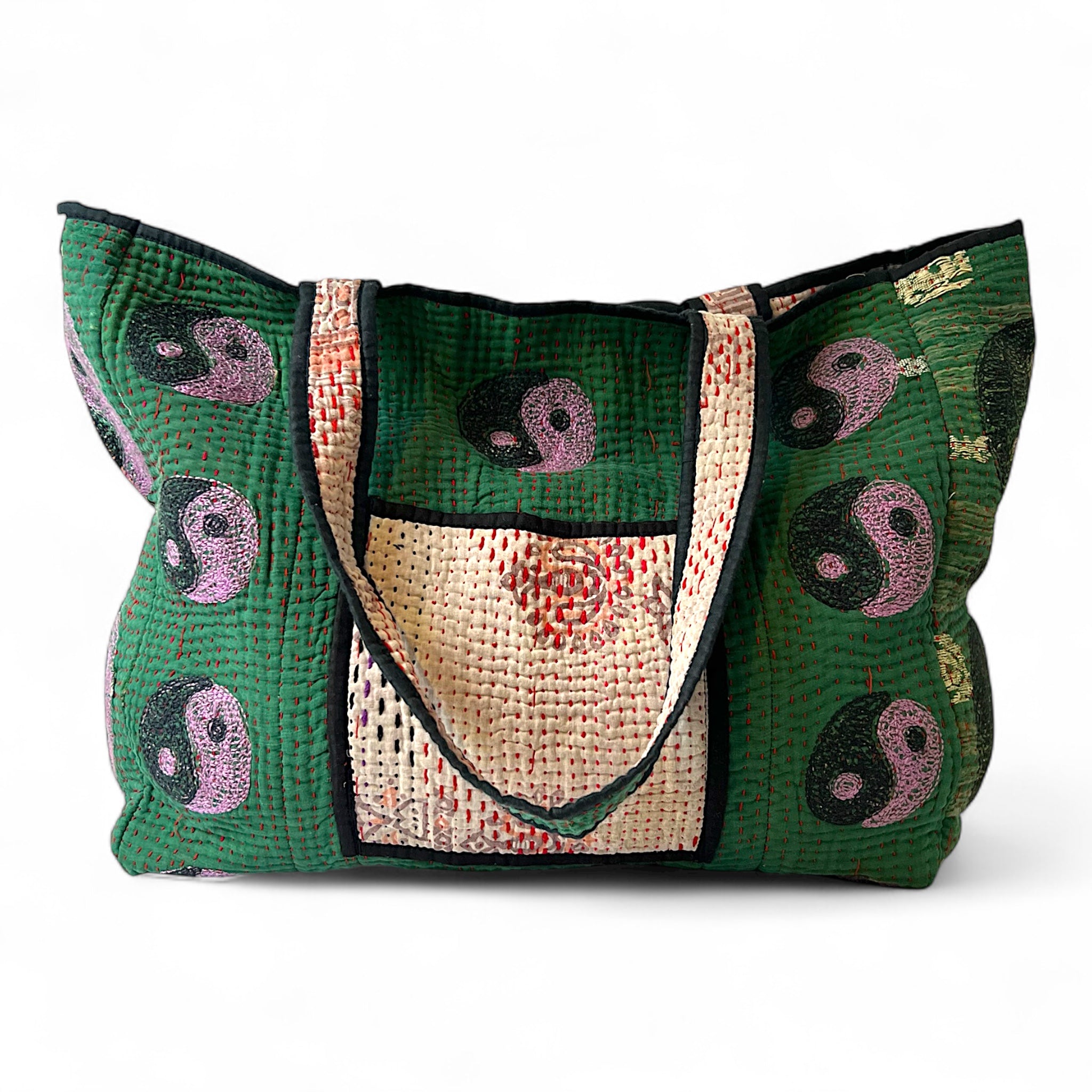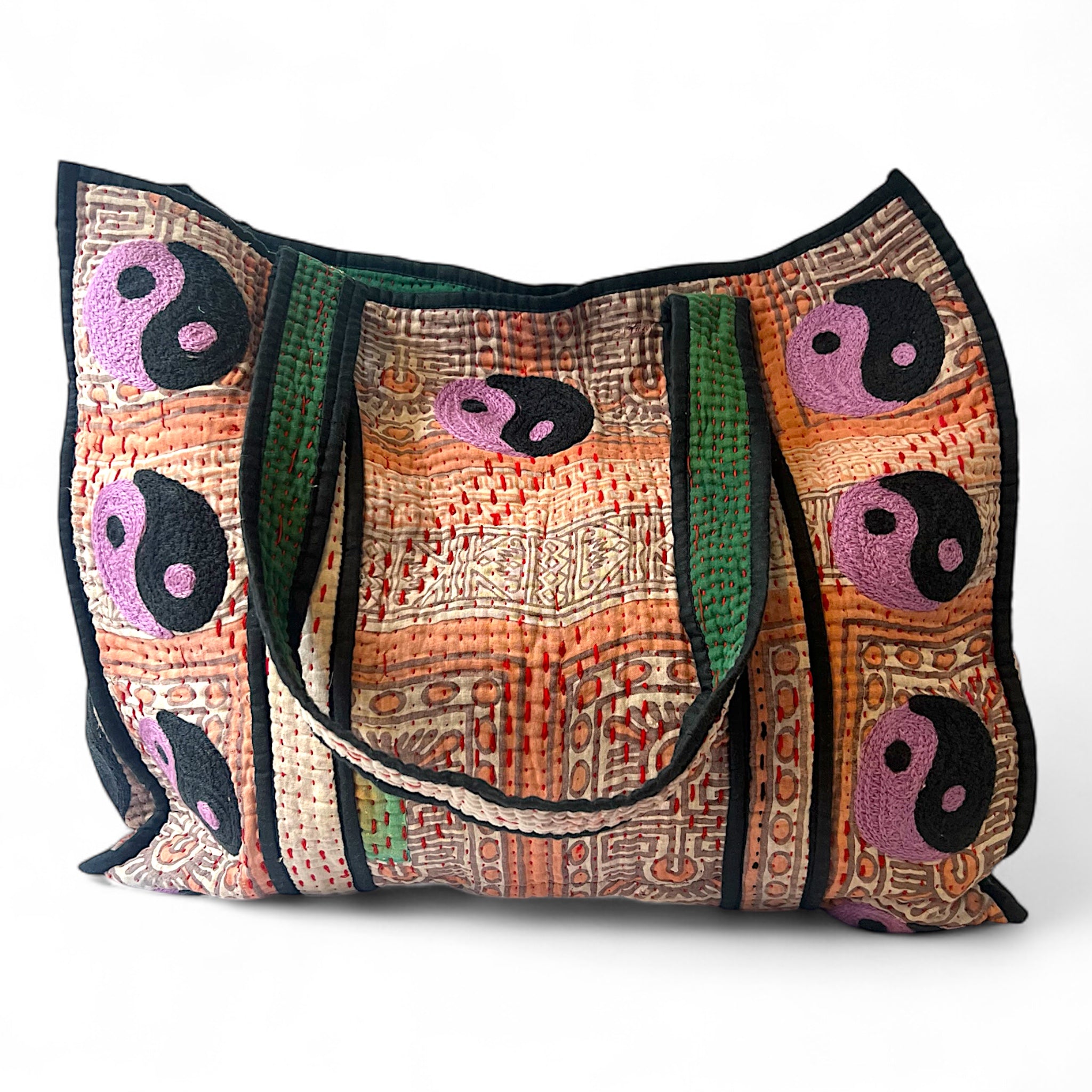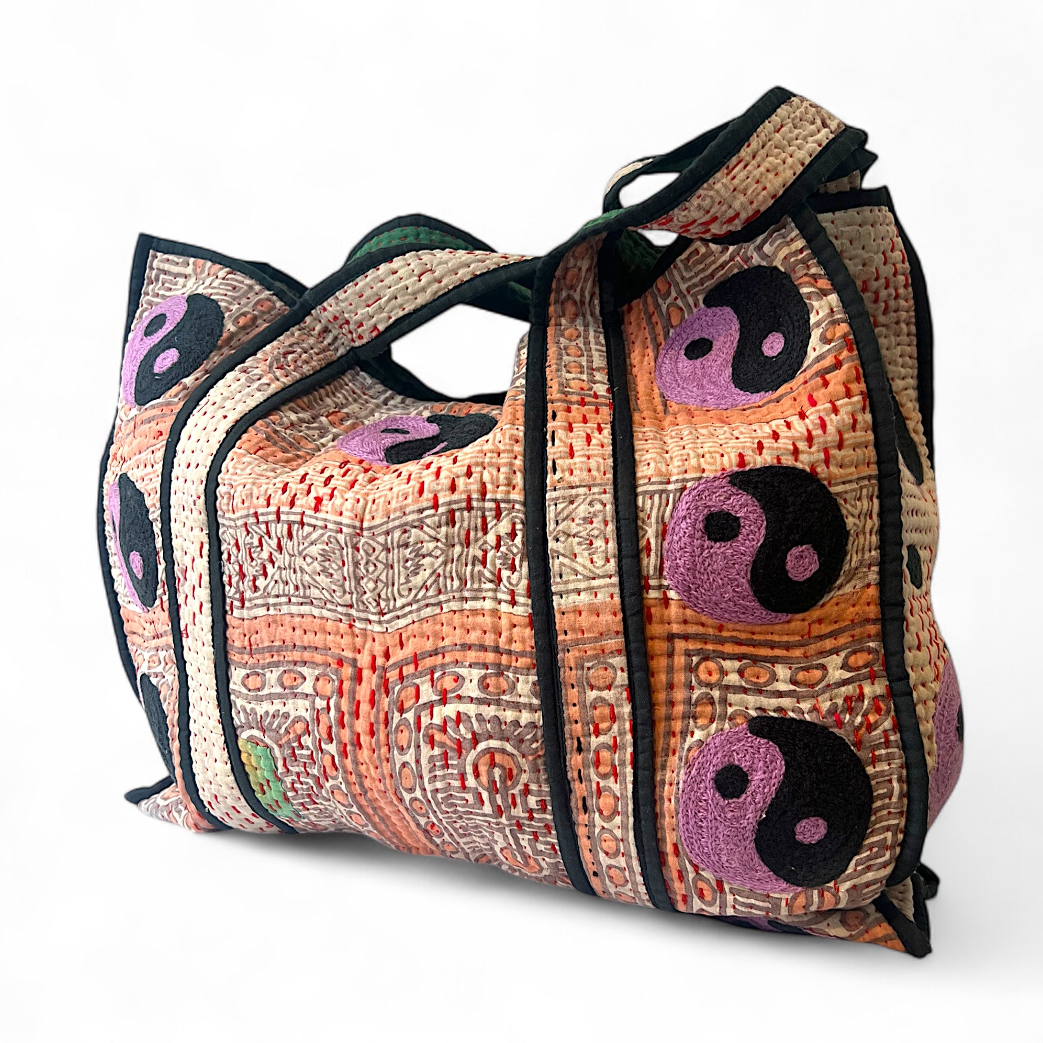 Our beautiful Dharma bags have been repurposed from vintage Kantha textile and then accentuated with our embroidered motifs. Dharma part 2 range are all reversible, there is 1 pocket inside which becomes the outside pocket when reversed, both sides are included in photos.