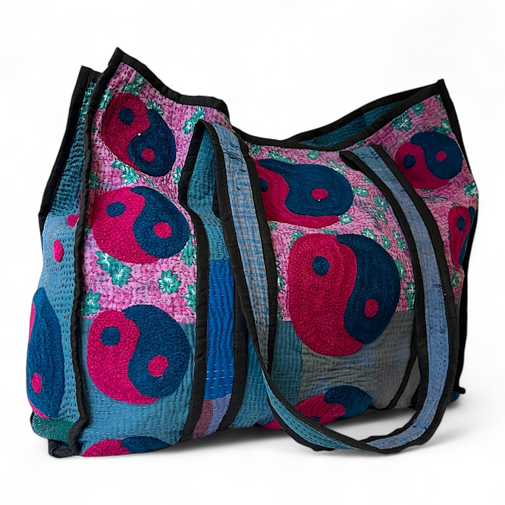 Our beautiful Dharma bags have been repurposed from vintage Kantha textile and then accentuated with our embroidered motifs.  Dharma part 2 range are all reversible, there is 1 pocket inside which becomes the outside pocket when reversed, both sides are included in photos.